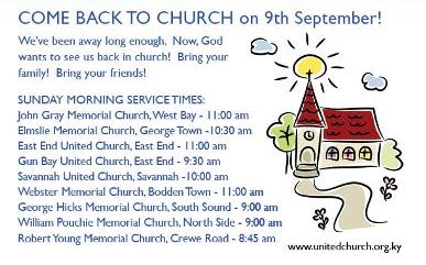 Everyone knows that for many of us it can be hard getting back into the groove of heading off to worship service every Sunday morning after having taken a break, whether because of vacation, illness or other circumstances. Sometimes the ‘break’ drags on – and on! But we equally know that God wants us to join in regular worship and fellowship, to help us in our daily lives and lead us to salvation and eternal life in Christ. And throughout the Bible God shows His yearning care for those who are not ‘in church’ (in the fold of those who follow Him) and to bring back those who have wandered off from His flock. So, taking the lead from the Back to Church Sunday movements in the UK, US, Australia, etc., the United Church has planned for a special Back to Church Sunday on 9th September, to coincide with the end of school holidays and traditional summer vacations for many. The date also recognises the anniversary of our Church’s arrival in Cayman on 11th September 1846 – when the people realised that the years living without a church hadn’t really been fun at all! So they eagerly greeted the opportunity to return to Church and to God, looking forward expectantly to the better way of life, which followed. In a similar way, we also recognise the need once again for us as a country ‘to turn back to God’ with enthusiasm and sincerity. Therefore, in all 9 of the United Church Congregations across Grand Cayman we are planning this special welcome back service to celebrate the ‘joy of the Lord’ (see times etc. below). All our members are being asked to make special efforts to follow God’s commands and invite their family members, friends, co-workers, schoolmates and others who haven’t been to a church recently or do not attend church regularly to come back to church, come back to God, with us that Sunday (and keep coming back). Be sure to do your part and get the invitation cards, etc. from your congregations and start telling others!