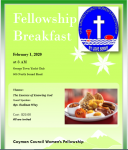 Fellowship Breakfast on Saturday, February 1, 2020. It will be held at the George Town Yacht Club. Tickets cost $25.00 and are available from members of the Women's Fellowship in ...Posted by: Administrator Wednesday Jan 22, 2020 14:02